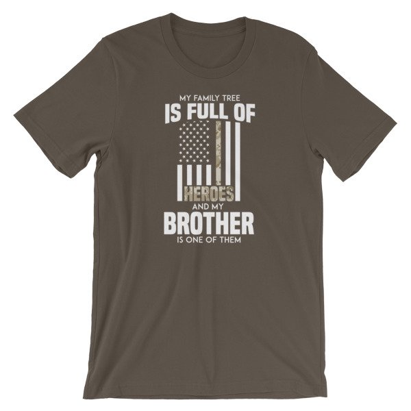 If your brother is in the military and you are proud, let him know he’s a hero in your eyes with this t-shirt and the thin camouflage line. Is your family full of hero’s? Is your brother proudly serving his country in the military. Shout out your pride with this shirt.