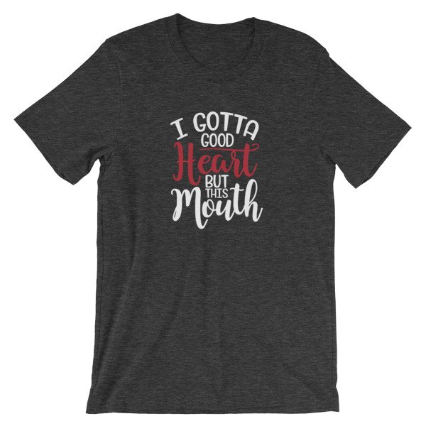 Know someone that has a good heart but sometimes has a mouth that docent follow suit. This would be a great gift for these friends and family. Or perhaps you are the one that has the mouth that doesnt always follow your Hearts lead, this would be a great t-shirt for you.