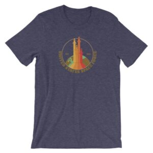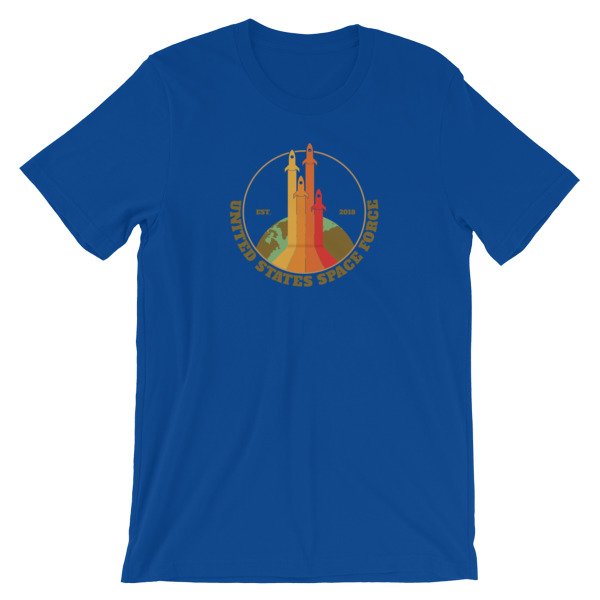 The President has spoken and the United States needs you in the newly established Space Force. Retro styled and colored rockets soaring above earth. United States Space Force Established 2018.