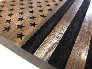 Each wooden flag is made from your choice of wood and laser engraved. It is then finished with a clear gloss polyurethane and gets 2 to 3 coats that protects from moisture and UV. Due to the unique characteristic of every piece of wood no 2 flags are the same.